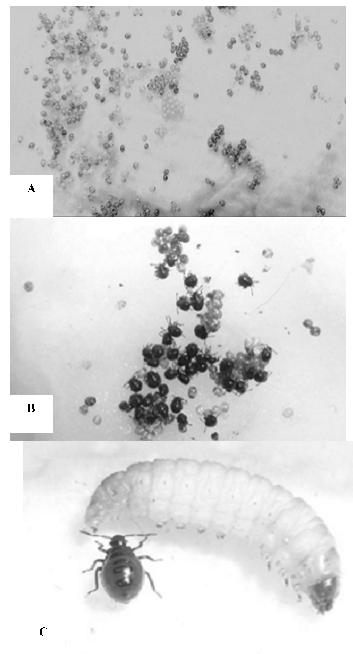 El huevo es esférico, de 0.5 - 1.00 mm de diámetro, de color plateado brillante al momento de la postura oscureciéndose conforme se acerca la etapa de eclosión, de un color oscuro en el día 4, anaranjado-rojizo en el día 5, adoptando forma ovalada (Figura 1A). La hembra produce una postura de 10 a 50 huevos. La incubación necesita ligera humedad.