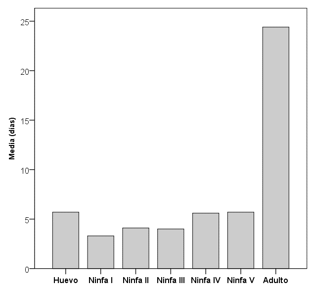 A una temperatura de 23 °C ± 5 °C, con 72% ± 6% de humedad relativa, alimentados con larvas de Galleria sp., para los individuos de P. nigrispinus se registroó una media de 5.7 días para la eclosión de los huevos y para las ninfas se registraron: 3.3, 3.1, 3.0, 4.6 y 5.7 días, respectivamente, para cada instar del primero al quinto. En los adultos, se obtuvo un promedio de 24.4 días de longevidad (Figura 4).