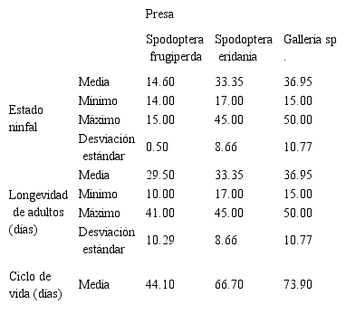 Se evaluó la duración de los estados ninfa y adulto, en días, de P. nigrispinus, en 10 individuos alimentados con larvas de Spodoptera frugiperda, Spodoptera eridania y Galleria sp.