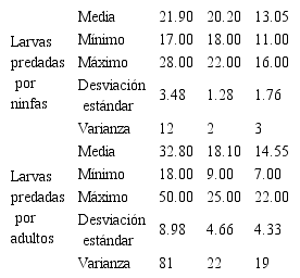El número de larvas predadas depende de la especie y el estadio en que se encuentre el predador. Se obtuvo la capacidad predadora del estado ninfal de P. nigrispinus en Spodoptera frugiperda, Spodoptera eridania. Galleria sp. una media de 21.90, 20.20 y 13.05 larvas consumidas respectivamente, mientras que el estado adulto de P. nigrispinus consumió un total de 32.8, 18.1 y 14.55 larvas (Tabla 2).