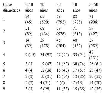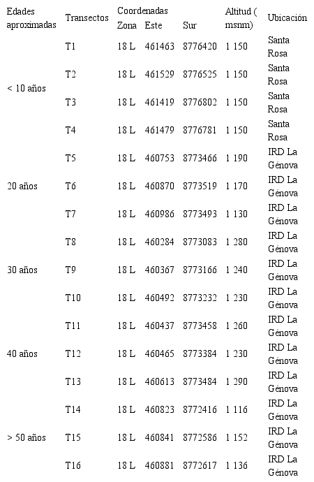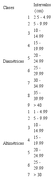 Se establecieron clases diamétricas de 5 cm para analizar el número de especies (Diversidad Alfa) que se registra en cada clase. Asimismo, para el caso de las clases altimétricas se establecieron clases de 5 m (Tabla 2). Los transectos fueron analizados en su conjunto para cada una de las edades estudiadas.
