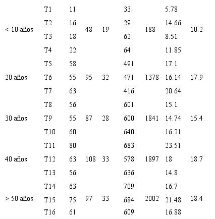En lo que respecta a la recomposición de la Dα en bosques de diferentes edades (Tabla 3), se aprecia que los valores de este parámetro son muy modestos entre las edades de < 10 años, haciéndose considerablemente mayores desde el rango de edad 20 años en adelante. Cuando se toma en consideración la cantidad de individuos registrados empleando el índice de diversidad Alfa de Fisher, se observa también que es a partir de 40 años en adelante que se produce una recuperación sustancial de la diversidad de especies arbóreas presentes.