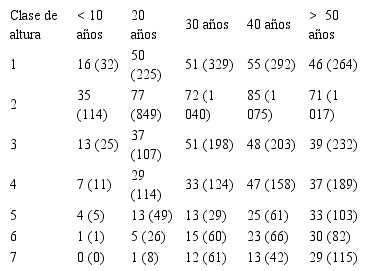 La observación de los datos de los TG levantados muestra que, en todos los casos, las tres primeras clases diamétricas, 2.5-14.99 cm de diámetro, registran las abundancias más altas (Tabla 4). Los valores hallados sugieren que, a nivel de especies e individuos, existe una gran diferencia entre los bosques pioneros (menores a 10 años) y los bosques a partir de 20 años de edad. Asimismo, en la Figura 2 se puede apreciar (a excepción del bosque de < 10 años) que las curvas reflejan una distribución de “J invertida” donde la mayor cantidad de individuos se hallan en las clases diamétricas menores. Esto indica una tendencia clara hacia la reposición del bosque. Con respecto a los resultados obtenidos para las clases altimétricas (Tabla 5), podemos apreciar que tanto la mayor cantidad de especies como individuos se hallan en la segunda clase (5 - 9.99 m), y si bien se esperaría una tendencia de “curva normal” en las clases altimétricas (Figura 3) esta tiende hacia la izquierda, agrupando las mayores cantidades de individuos en las tres primeras clases.