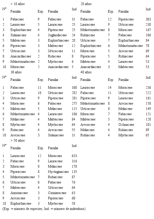 En cuanto a la composición por familias a lo largo de diferentes edades (Tabla 6), se perciben algunas tendencias de interés. Recién a partir de los 40 años, la familia Piperaceae deja de ser un componente marcadamente abundante en el bosque. Del mismo modo, a partir de los 20 años la familia Moraceae comienza a presentar una mayor cantidad de individuos, hasta llegar a ser la más importante en los bosques maduros (˃ 50 años). Con respecto a la diversidad, en todas las edades de bosque las familias Fabaceae y Lauraceae, de modo bastante estable, presentan las mayores cantidades de especies, aunque no necesariamente las especies son las mismas en todas las edades. Observamos también que en los bosques maduros (˃ 50 años), aparecen familias adicionales que no se habían registrado en edades anteriores (Connaraceae, Nyctagynaceae), y Annonaceae emerge como una de las familias más diversas.