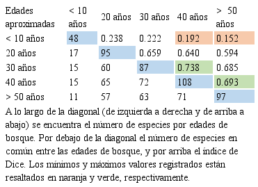 El análisis de similitud (índice de Dice; Tabla 7) revela que la composición florística de las edades tempranas (< 10 años) es poco compatible con la de bosques mayores de 20 años, con una similitud menor al 24%. La similitud de los ensamblajes de especies se hace notoria en bosques a partir de 20 años en adelante, y muy notoria en bosques de 30 años en adelante, edad a partir de la cual 69-74% de las especies del bosque son las mismas que en edades más avanzadas. Bosques entre 30 y 40 años de edad son bastante similares entre sí en ese sentido; y los bosques mayores de 50 años tienen un ensamblaje de especies ligeramente diferenciado de ellos.