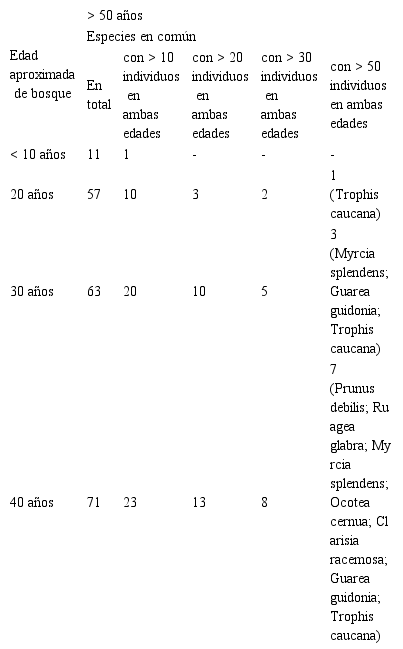 Finalmente, observamos que pocas de las especies compartidas entre diferentes edades presentan gran abundancia (Tabla 8). La mayoría de especies compartidas presentan pocos individuos, siendo el caso extremo las especies en común entre los bosques de < 10 años y > 50 años, donde sólo una presenta más de 10 individuos en ambas edades. A medida que se incrementa la edad de los bosques, existen menos especies compartidas con un alto número de individuos. Se llega a compartir siete especies con más de 50 individuos en los bosques de 40 años y > 50 años. A partir de los 20 años, la especie Trophis caucana es un componente abundante en común con los bosques maduros (> 50 años).