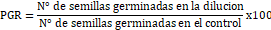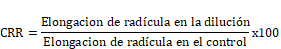 La prueba de fitotoxicidad se realizó utilizando semillas de lechuga (Lactuca sativa) variedad Duett, siguiendo la metodología propuesta por Sobrero & Ronco (2008). Para el cálculo del índice de germinación (IG, Fórmula 1) se siguió la metodología seguida por Zucconi et al. (1981). Se calculó el porcentaje de germinación relativo (PGR, Fórmula 2) y el crecimiento de radícula relativo (CRR, Fórmula 3) para cada dilución y se usó agua destilada control. Las ecuaciones utilizadas fueron:
