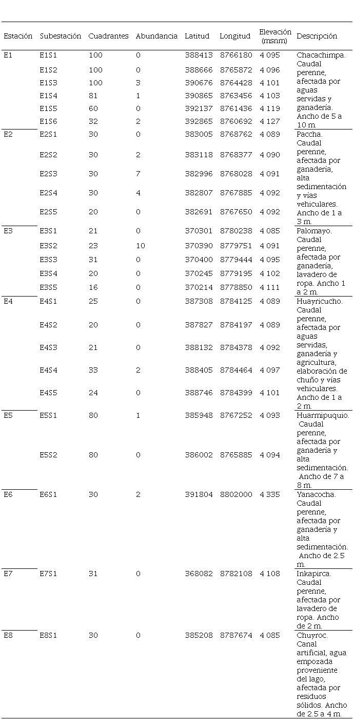 La evaluación de cada estación en campo se llevó a cabo por uno o dos evaluadores, durante dos horas aproximadamente. En la búsqueda también se registró la presencia de peces del género Orestias (Valenciennes, 1839), y de las especies Trichomycterus oroyae (Eigenmann & Eigenmann, 1889) y Oncorhynchus mykiss (Walbaum, 1792).