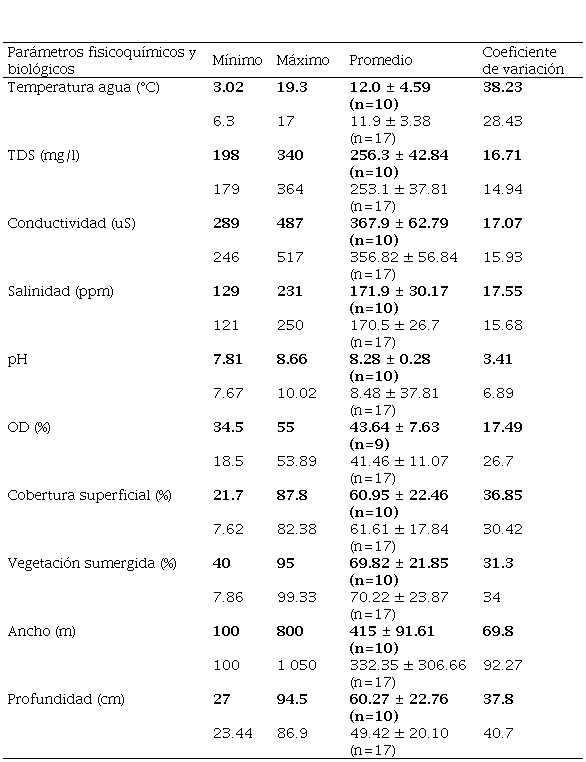 Luego, se determinaron los valores mínimos (min), máximos (máx) y promedios de los parámetros fisicoquímicos del microhábitat de las subestaciones. Los análisis fueron ejecutados en PAST 3.15 (Hammer et al., 2001). La vegetación sumergida, cobertura superficial y profundidad fueron analizadas como promedios en las subestaciones.