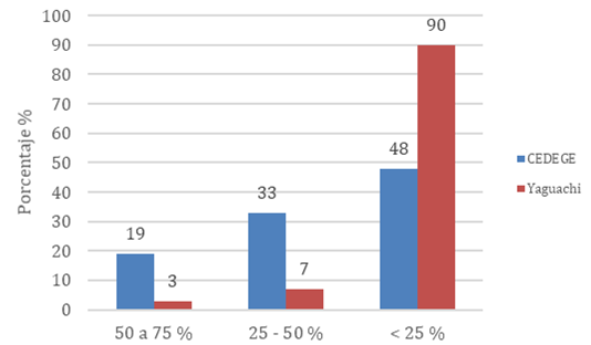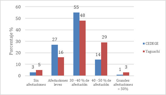 Los valores de compactación en Yaguachi, entre los 0 y 30 cm de profundidad del suelo presentaron un rango de 180 a 300 psi; es decir, los suelos en general presentan un grado de compactación elevado, el cual tiene un efecto negativo en el desarrollo de las raíces. El riego, la mecanización, la aplicación de fertilizantes y otras actividades mal balanceadas, son la causa fundamental de la degradación física, manifestándose por compactación, erosión y mal drenaje del suelo (Martínez et al., 2019).