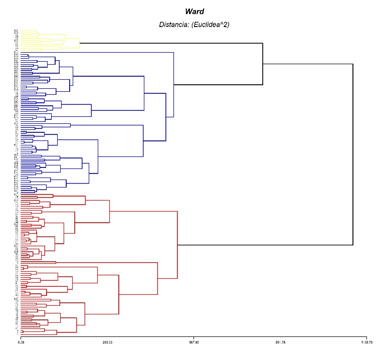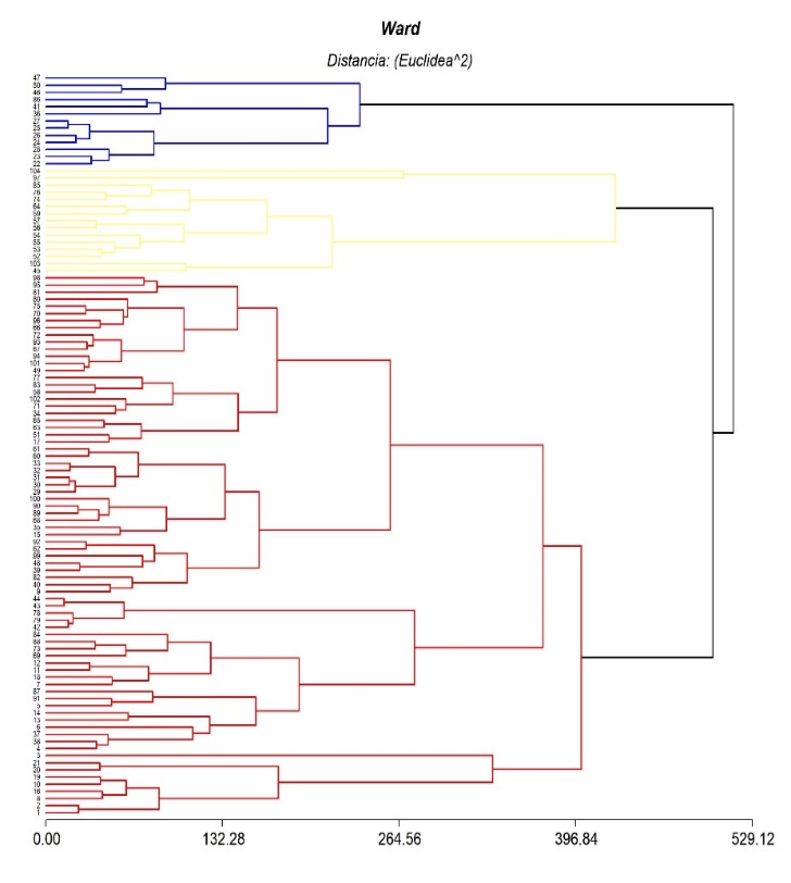Al aplicar el método Ward y la distancia euclidiana al cuadrado, comparando con lo expresado por Martínez (2013), se formaron 3 grupos de sistemas, como se muestra en la Figura 18, de los cuales el primero corresponde al segmento de productores del sistema de producción desarrollado (SPD) con 14%, el conglomerado 2 corresponde a sistemas de producción medianamente desarrollado (SPMD) con 13% y el tercero agrupa la mayor parte de productores que conforma el sistema de producción básica (SPB) con 73%.