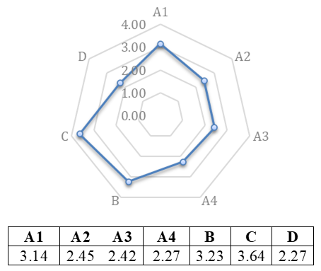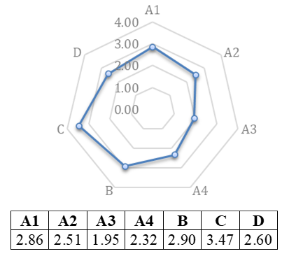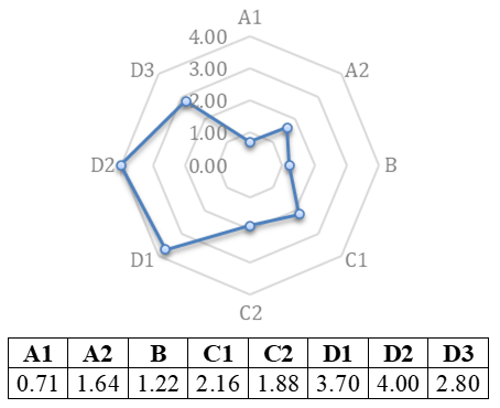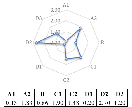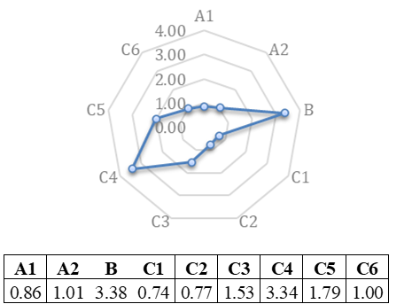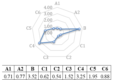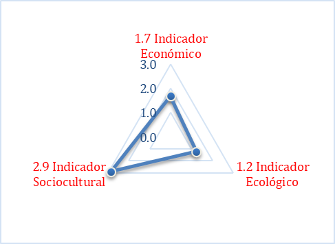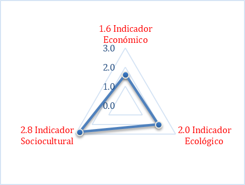 Las Figuras 20, 21, 22, 23, 24 y 25 presentes en este apartado, muestran el resultado del análisis de la información obtenida en la investigación. Utilizando los indicadores y sub indicadores ya establecidos, se procedió a valorar según la escala propuesta a cada uno de ellos, empleando las Fórmulas 2, 3, 4 y 5 respectivamente para las dimensiones sociales, ecológicas y económicas, obteniendo los índices de sustentabilidad, graficados en esquemas tipo ameba donde se establecen los puntos críticos de sustentabilidad inferiores o iguales a dos y los indicadores con sustentabilidad alta, igual o superior a tres.