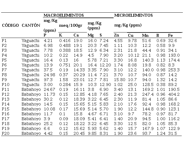 Con respecto al contenido de micro elementos en las zonas evaluadas, se determinó una tendencia contraria a la señalada para los macro elementos, esto es, en el sector de Babahoyo los contenidos de cobre (Cu), hierro (Fe), manganeso (Mn), Zinc (Zn) y boro (B) fueron mayores que en el de Yaguachi. Estos resultados están relacionados con la movilización de los microelementos metálicos (Cu, Mn, Zn, Fe,) los cuales se movilizan preferentemente a través del sistema orgánico en los suelos, mientras que los macro elementos (K, Ca, Mg) lo hacen a través del sistema inorgánico (Tabla 8).