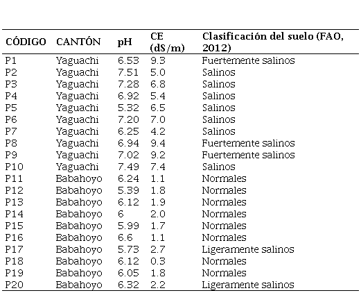 En la zona de Yaguachi según los análisis de pH, se puede apreciar que estos varían de 5.32 a 7.51. Con respecto a la conductividad eléctrica (CE en dS/m) se aprecia un rango de 0.3 a 9.4, siendo estos los valores más altos de CE. Los suelos de esta localidad son clasificados como salinos y fuertemente salinos causando efectos negativos en el comportamiento de los cultivos de arroz que se realizan en estos sitios. Estos suelos se caracterizan por un pH de carácter alcalino, con contenido sódico elevado (psi > 30%; psi: libras por pulgada cuadrada) (Briones et al., 2010).