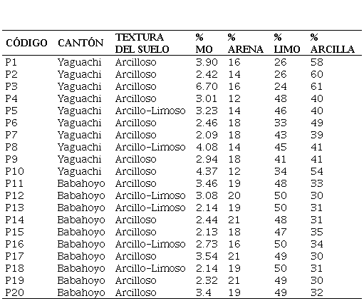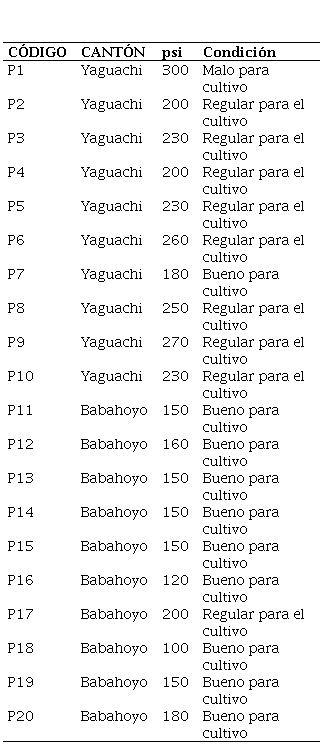 En el caso de Babahoyo, los valores variaron de 120 a 180 psi: estos valores indican que los suelos tienen en general menor grado de compactación, lo cual permite una mayor infiltración y exploración de raíces (Tabla 10).