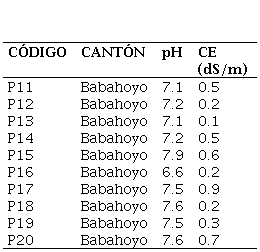 Por otro lado, los suelos del sector de Babahoyo, tienen niveles de conductividad eléctrica que en ningún caso supera los 4 dS/m y son clasificados como ligeramente salinos y normales (Tabla 9).
