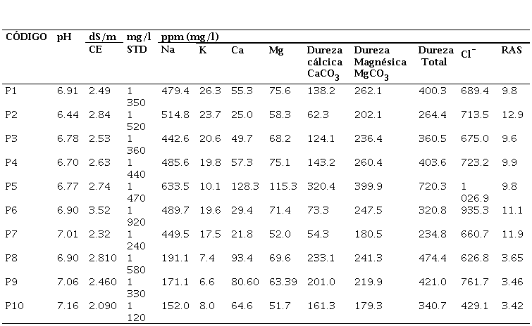 CE: Conductividad eléctrica; STD: Sólidos totales disuelto; Cl-: Ión cloruro; RAS: Razón de adsorción de sodio.