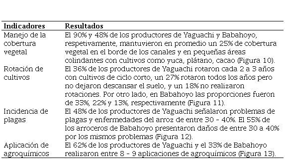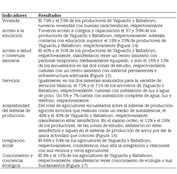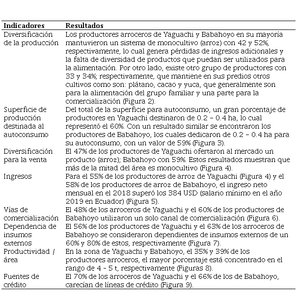 Sobre el nivel de sustentabilidad del cultivo de arroz, el Índice de Sustentabilidad General para Yaguachi fue de 1.93 y para Babahoyo, de 2.12; valores determinados mediante el análisis de las dimensiones económicas, ecológicas y socioculturales, mostrando diferencias entre la zona salinizada y la no salinizada.
