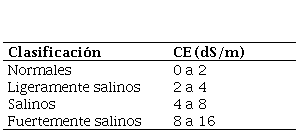 Los suelos con presencia de sales se clasifican de acuerdo a la conductividad eléctrica, como se muestra en la Tabla 1.