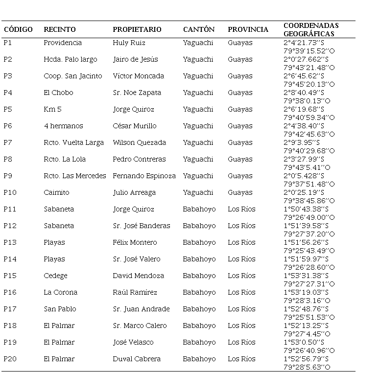 Para el muestro del agua se seleccionaron 10 áreas (Tabla 2), los sitios se seleccionaron utilizando el mapa del Cantón Yaguachi y el de Babahoyo. Las muestras se tomaron en la parte superficial de tres sitios diferentes, la cantidad fue de un litro en una botella de polietileno. Esta se llenó hasta al ras del envase, luego fue trasladada al laboratorio. Los puntos de muestreo se establecieron alrededor de los nacimientos de los canales de riego y terminaron en los campos en donde se aprovecha esta agua para irrigación.