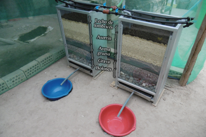 La lombriz roja californiana (Eisenia foetida Savigny 1826) se caracteriza por su rusticidad, flexibilidad a los factores ambientales (humedad, temperatura y pH), y capacidad de reproducción y apiñamiento. Este anélido fotofóbico se alimenta de todo tipo de desechos orgánicos de origen animal o vegetal con 70% de contenido de humedad (Rodríguez, 2005) y es capaz de producir deyecciones ricas en flora bacteriana, consideradas como un excelente abono orgánico (García & Solano, 2005). Los sistemas de tratamiento de aguas residuales con lombricultura son sistemas biológicos de flujo vertical basados en la aplicación de lombrices (Vizcaíno & Fuentes, 2016), los cuales, debido a sus características físicas o estructurales, son altamente eficientes en la remoción de materia orgánica y organismos patógenos (Fernández, 2011, citado por Ramón et al., 2015). El agua residual es regada sobre el biofiltro compuesto por estratos de diversos materiales, en cuya capa superior se encuentra el material orgánico con un elevado número de microorganismos y lombrices. Este afluente percola a través de los distintos estratos del medio filtrante, quedando retenida en las capas superiores la materia orgánica contenida en el agua residual, que luego será consumida por las lombrices y organismos asociados (Fernández, 2011, citado por Ramón et al., 2015).