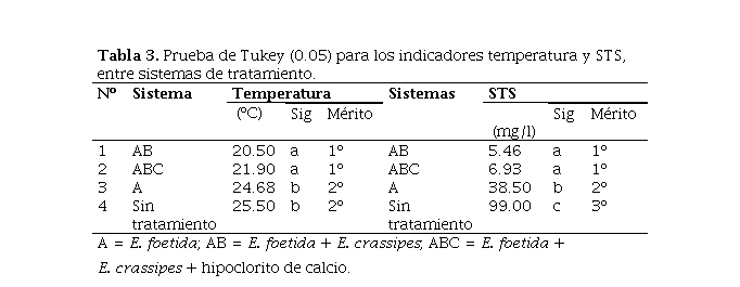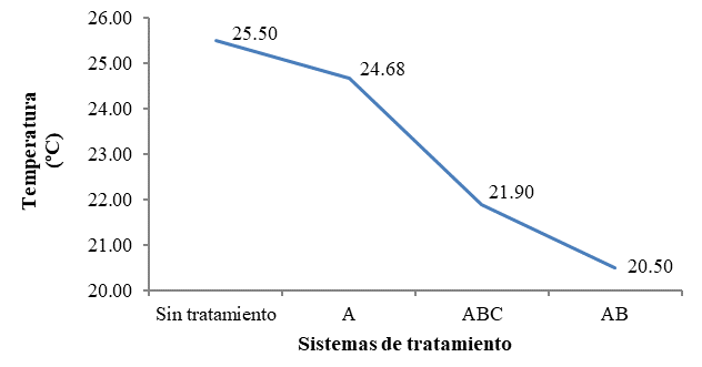 En relación al afluente, la temperatura tuvo un descenso de 0.83 ºC para A, 5.00 ºC para AB y 3.60 ºC para ABC, respectivamente, existiendo diferencias estadísticas entre los sistemas propuestos, teniendo AB y ABC un mayor efecto en el descenso de los valores de este parámetro.