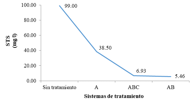 Los STS alcanzaron una eficiencia de remoción de 61.11% para el sistema A, 94.48% para AB y 93.01% para ABC, considerándose tanto a AB como a ABC como los sistemas que tuvieron un mayor efecto en la reducción de este parámetro.