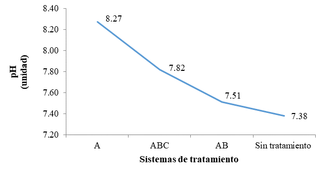 Los resultados de la prueba de Tukey, expuestos en la Tabla 5, muestran que tanto el agua residual sin tratamiento como el sistema AB presentaron los valores de pH más cercanos a la neutralidad, con promedios de 7.38 y 7.51 unidades, respectivamente; seguidos por el sistema ABC, y en tercer y último lugar por el sistema A, lo cual se puede ver reflejado en la Figura 4.