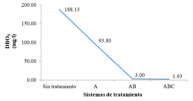 La DBO. presentó una eficiencia de remoción de 50.14% para A, 98.41% para AB y 98.98% para ABC, demostrando estadísticamente que AB y ABC fueron los sistemas más eficientes en la reducción de la concentración de la DBO. del afluente.