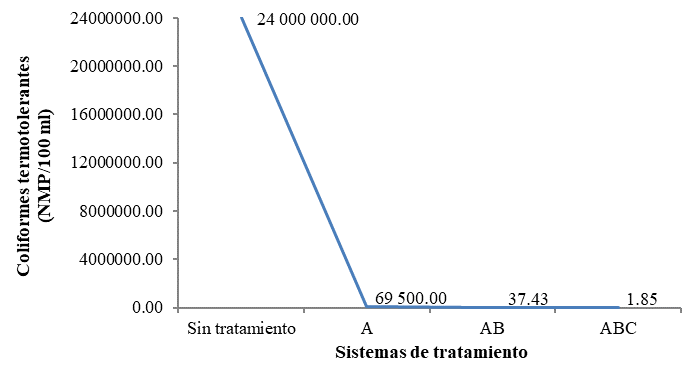 De manera similar, las coliformes termotolerantes experimentaron una reducción de 99.71% en A, y de 100.00% tanto en AB como ABC, situación que fue reafirmada estadísticamente a través de la prueba de Tukey, definiéndose que tanto AB como ABC fueron los sistemas que tuvieron mayor efecto en la reducción de este parámetro.