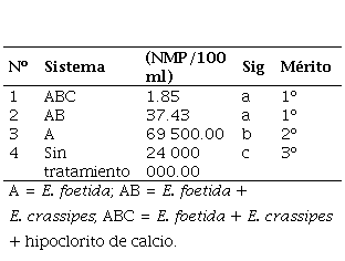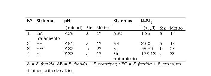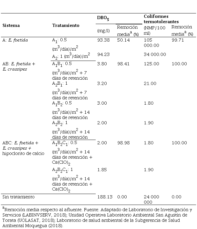 Se analizaron las características físicas, químicas y microbiológicas de los efluentes, determinándose que el sistema más eficiente fue el integrado por E. foetida + E. crassipes, seguido por el sistema E. foetida + E. crassipes + hipoclorito de calcio y, por último, el sistema con E. foetida.