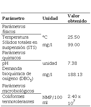 Los resultados del análisis de los principales parámetros físicos, químicos y microbiológicos del afluente se presentan en la Tabla 1.