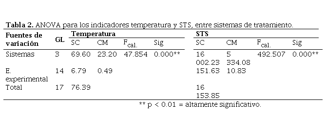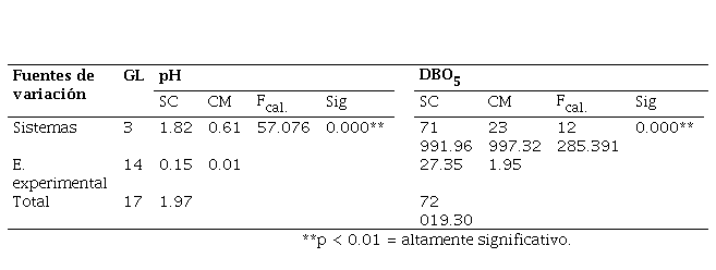 Los resultados obtenidos del ANOVA, aplicado a los parámetros físicos (temperatura y STS), químicos (pH y DBO.) y microbiológicos (coliformes termotolerantes) a la salida de cada uno de los sistemas de tratamiento, permitieron observar que la diferencia de medias de éstos fue altamente significativa, según se muestra en la Tabla 2, Tabla 4, y Tabla 6. Por lo tanto, con un nivel de confianza del 99%, al menos uno de los efectos de los sistemas sobre los parámetros de estudio fue distinto en todos los casos, procediéndose a realizar la prueba de Tukey al 5%.