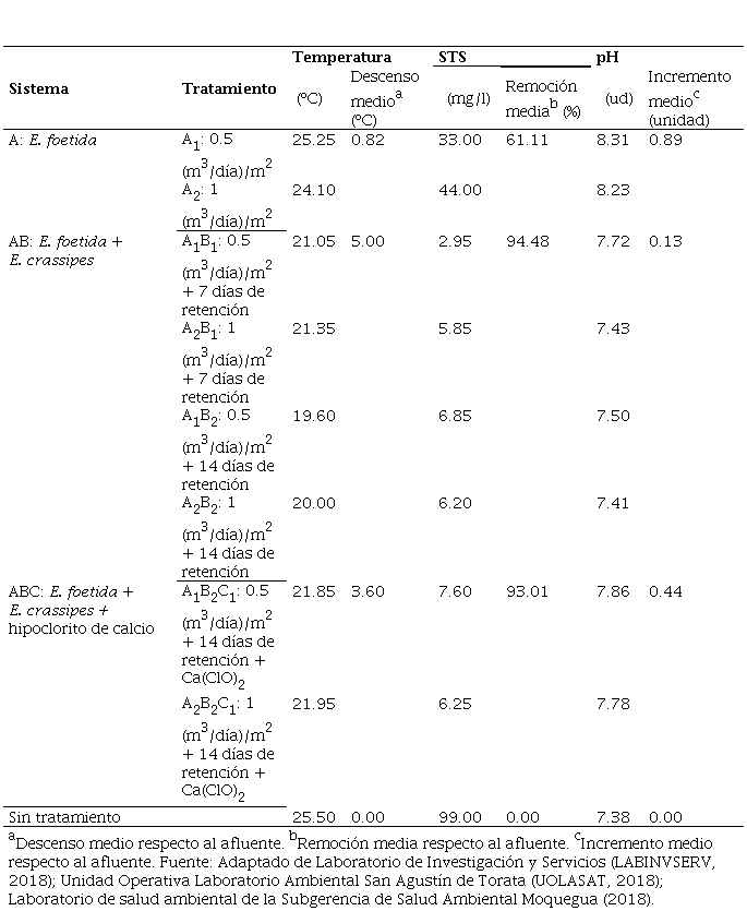 Tal como se observa en la Tabla 8, los efluentes de los sistemas AB y ABC, considerados como los más efectivos en la reducción de los parámetros físicos, presentaron un descenso medio de la temperatura de 5.00 y 3.60 °C, así como una remoción media de STS de 94.48 y 93.01%, respectivamente.