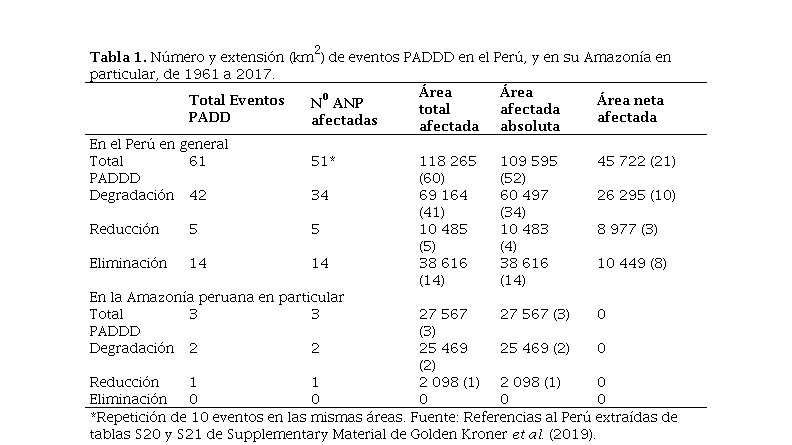 En la Tabla 1 se resume lo que Golden Kroner et al. (2019) apuntan sobre el Perú. Esta información no está en el artículo principal, pero sí en el material suplementario provisto por la revista (Tablas S20 y S21). En el artículo hay un mapa de América del Sur donde se ve el Perú con muchos casos PADDD en lugares que, por la reducida escala, no se puede saber a qué corresponden. Según el artículo, los 61 PADDD peruanos fueron realizados entre 1960 y 2017 y afectaron 51 áreas protegidas y a 11 826 500 hectáreas. De éstas, 42 habrían sufrido degradación del nivel de protección, otras 5 habrían sido afectadas por reducción del tamaño y 14 fueron eliminadas. En la misma Tabla 1 se incluyó lo que esos autores afirman en el caso de la Amazonía peruana donde indican se habría degradado dos áreas, de las que una se redujo, afectando a 2 756 700 hectáreas. Según los autores, el área total afectada por los eventos PADDD en el Perú “impactó sobre el 23% del área protegida en el país y que, como resultado de eso, se ha perdido permanentemente el 17% del área del sistema histórico de áreas protegidas, lo que representa el 4% de la superficie terrestre total de Perú”.