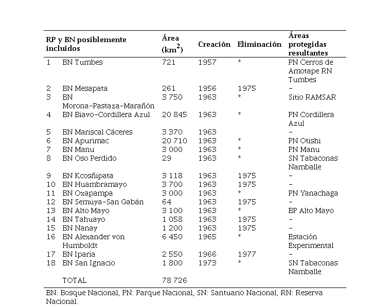 Para que exista un evento PADDD es condición sine qua non que exista un área natural protegida. Si no existe un área protegida, legalmente o en la práctica, no cabe haber PADDD. Si en el Perú los bosques nacionales, desde su concepción, estuvieron destinados a la producción maderera, no es razonable incluirlos como áreas protegidas. Los bosques nacionales fueron creados entre 1956 y 1973, aunque la mayoría datan de 1963. Esos bosques, en realidad fueron 18 a lo largo del tiempo (Tabla 2), sumaban 7 826 000 hectáreas a mediados de los años 1970. Si se suma a esa superficie el caso ya comentado de la Reserva Nacional Pacaya Samiria (2 080 000 ha), queda explicada en un 84% la cifra citada por Golden Kroner et al. (2019), que menciona PADDD afectando 11 826 500 hectáreas.