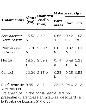 Los resultados obtenidos en los tratamientos inoculados fueron similares a los observados por otros autores en la producción de pinos. Chávez et al. (2009) encontraron un efecto favorable en el crecimiento de P. radiata cuando realizaron la micorrización controlada con Rhizopogon luteolus en condiciones de vivero. Steffen et al. (2017) también informan sobre el efecto positivo de la micorrización con Scleroderma citrinum en el crecimiento de Pinus elliottii . Pinus rigida.
