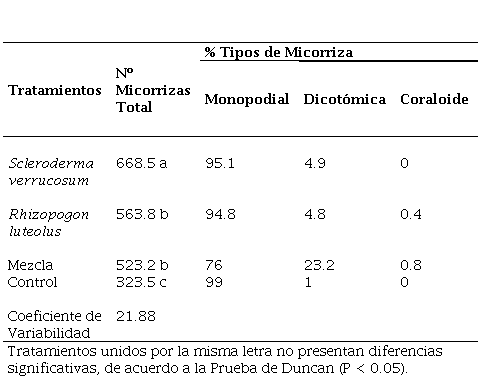 Al evaluar los tipos de micorrizas se observó mayor porcentaje de monopodiales (Tabla 2, Figuras 1B, 1C) en relación a los tipos dicotómicos (Tabla 2, Figura 1D) y coraloides, en todos los tratamientos, excepto en el de mezcla. En este último, se observaron 23.2% de micorrizas dicotómicas en relación a las micorrizaciones individuales en las que se observaron 4.9 y 4.8% para S. verrucosum y R. luteolus, respectivamente. Carrasco et al. (2010) y Galindo et al. (2015) mencionan que existen diferencias morfológicas entre las raíces ectomicorrizadas con diferentes especies de hongos, lo que no se observó en la presente investigación. Sin embargo, Baseia & Milanéz (2002) y Miyamoto et al. (2019) reportan también micorrizas monopodiales en árboles de la familia Pinaceae inoculados con Rhizopogon. Galindo et al. (2015) mencionan que el tipo de micorrizas en plantas de Pinus montezumae, inoculadas con Lacaria trichodermophora, podía variar de acuerdo con la edad de las plantas; en etapa inicial indican ramificaciones dicotómicas o bifurcadas y en etapa madura, micorrizas con una morfología coraloide.