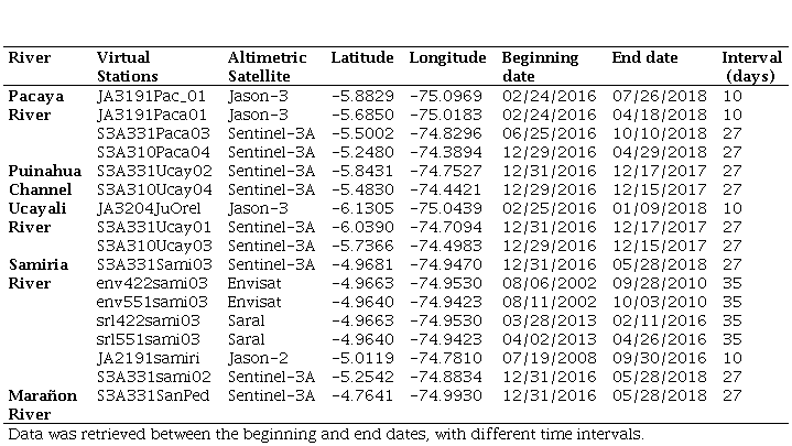 To assess water level in small rivers, we made use of spatial altimetry techniques retrieving data from different satellite missions. A set of altimetry-derived water level data retrieved from virtual stations in inner rivers (Pacaya and Samiria) vs. in situ hydrological data (2000-2017) in the major rivers (Ucayali and Maranon), was used to assess if behaviour in the inner rivers was similar to major rivers. In situ water level data were retrieved from the Critical Zone Observatory (CZO) – HYBAM database (HYBAM, 2018). Requena water level gauge station (REQ) is located in the Ucayali River downstream the river mouth of Pacaya River, whereas San Regis (SRG) is located in Marañon River downstream Samiria River mouth (Figure 1). Altimetry-derived water level data were obtained from different space agencies: Collecte Localisation Satellites (CLS, 2018) for Jason-2, Copernicus Open Access Hub de l'ESA (European Spatial Agency) (ESA, (2018) for Sentinel-3A, Satellite Data and Services Center (AVISO+, (2018) for Saral and Jason-3, Center for Topographic studies of the Ocean and Hydrosphere (CTOH, (2018) for ENVISAT. Three families of altimetry satellites (Figure 1) were used to define a set of virtual stations: Jason-2 and Jason-3 with a return cycle of 10 days, ENVISAT and Saral with a cycle of 35 days and Sentinel-3A with a return cycle of 27 days. A total of four virtual stations for Pacaya River, and seven for Samiria River, were spatially distributed so that spatial representativeness was covered (Table 1). For Samiria River, five out of the seven virtual stations happened to be located close together at the same geographical point (S3A331Sami03, env422sami03, env551sami03, srl422sami03, srl551sami03). This “multistation” was used to obtain temporal representativeness (Aug 2002 – May 2018). More detailed information on altimetry can be found in Fu & Cazenave (2001).