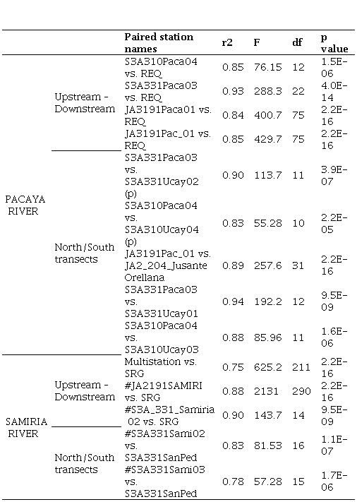 In Figure 3, altimetry-derived data from Jason-2 in Samiria River follows the same temporal variation of SRG located 210 km far away from the virtual station in the Marañon Basin. Similar results were obtained for virtual station S3A331_Samiria02 and the Multistation in Samiria River located upstream from SRG, with R-squared values of 0.9 and 0.75, respectively (Table 2). Synchronic behaviour was also found for Ucayali Basin between the four virtual stations in Pacaya river vs. REQ in situ gauging station in Ucayali River. These virtual stations (JA3191Pac_01, JA3191Paca01, S3A331Paca03, S3A310Paca04) obtained correlation values ranging between 0.84-0.93 (Table 2).