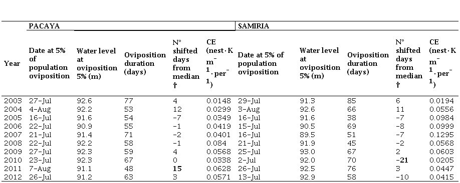 Although these temporal shifts may be considered a good trait facing extreme events, extreme shifts towards late oviposition could also pose a threat for the population. Since incubation period requires a time window of 55 – 70 days, extreme delays in oviposition onset may be risky when the next rainy season starts earlier. Considering that mean oviposition duration for our database was 61.5 days ± 11.7 SD (n = 53 795 nests), 15 days of delay during 2011 represents between 22-32% of the oviposition period, thus increasing inundation risk at the end of incubation. Nest loss via inundation reached between 28 – 50% during 1980 and 1982, in the same location of this study (Soini & Soini, 1982). It has been suggested that if extreme floods return with a frequency of less than 10 years, population decline is likely to occur in few decades (Véliz Rosas, 2012). For P. expansa in Trombetas River (Brazil) an increase of 137 cm of water height would result in 50% of mortality (Eisemberg et al., 2016). Additionally, when oviposition onset for P. unifilis is delayed, increased competition for space may occur due to an overlap in oviposition time with P. expansa which breeds later (Soini & de Soini, 1986).