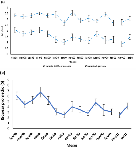 Además, la evolución temporal de la diversidad gamma Dens, gamma IVIg, Cinv Abundancia, Cinv Cobertura y Cinv IVI. Para los coleópteros y las aves se evaluó la abundancia S (el número de especies), DMn (el índice de riqueza de Menhinick, Fórmula 5), J’ (el Índice de equidad de Pielou, Fórmula 6), la diversidad alfa promedio y la diversidad gamma (Magurran, 1988). Los intervalos de confianza para la diversidad gamma de coleópteros y aves se obtuvieron mediante el programa PAST 2.7 (Hammer et al., 2001) realizándose el “Bootstrap” a un nivel de 95% de confianza.