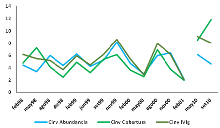 Al evaluar en el tiempo, las variables claves más importantes son la cobertura vegetal promedio y el IVIg de la vegetación. Para los tres Cinv (Inverso del Índice de Simpson) son más abundantes más especies nativas para el Perú y de una a dos especies endémicas; solo en dos ocasiones aparece una especie exótica en las variables abundancia e IVI del Cinv. Si bien al observar a los tres Cinv, se puede elegir al Cinv IVI como el más integrador (Figura 10), se puede resaltar que cuando se evalúa el Cinv cobertura solo predominan especies nativas y endémicas, y hay una ligera influencia del Niño 1998 en su permanencia hasta setiembre de 1999. Por lo que se puede notar, la loma presenta momentos donde hay un mayor aporte de las especies endémicas luego de un ENOS; se aprecia esto en el último muestreo donde se tiene el mayor número de especies endémicas, siete por su cobertura y cuatro por su IVI. Por ello se sugiere que el Niño Global es activador de la memoria histórica de los ecosistemas de lomas para la variable biótica vegetación, y eso se da porque responde positivamente a la reproducción de las semillas preexistentes, probablemente porque es muy importante para el mantenimiento a largo plazo de los bancos de semillas, siendo las características morfológicas y fisiológicas de las semillas, importantes para los años en que solo la niebla proporciona humedad (Leiva et al., 2014).