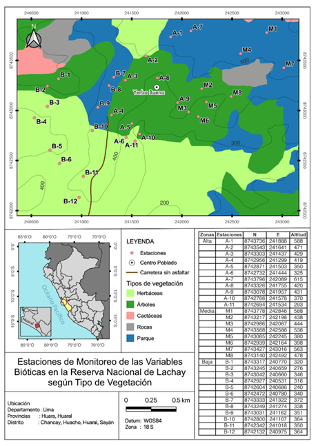 La Reserva Nacional de Lachay se encuentra en los 11° 20´ 48´´ L.S. y 77° 19´48´´ L.O., en los distritos de Sayán, Chancay, Huacho y Huaral del Departamento de Lima, abarca una superficie total de 5 070 ha (MINAG, 1979). El área de estudio estuvo restringida a 200 ha, se mantuvo la zonificación de los anteriores estudios, en 31 parcelas con alta (A), media (M) y baja (B) afluencia de visitantes (Figura 1). El esfuerzo de muestreo en cada una de las parcelas fue el siguiente: 15 muestreos para plantas y aves, y 19 muestreos para coleópteros.