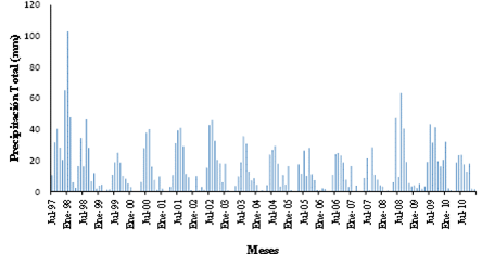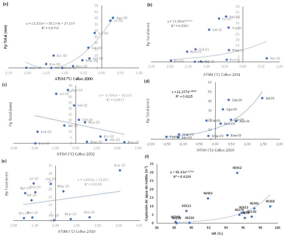 Los datos de la precipitación total mensual desde julio de 1997 hasta diciembre del 2010 (Figura 2) y la Humedad Relativa del año 2010 fueron proporcionados por el SENAMHI. Los datos de las ATSM del Callao 2000 al 2002, 2009 y 2010 (IMARPE, 2022) y la captación de agua de niebla del año 2010 en las lomas son datos de la Reserva Nacional Lomas de Lachay. Se realizó un análisis de autocorrelación mediante el PAST 2.7 (Hammer et al., 2001), en tres periodos de 18 meses donde se dieron los eventos El Niño, el primer periodo fue desde julio 1997 a diciembre 1998, a este Niño se le denomino El Niño Extraordinario (1997-1998) este fue un FEN (Fenómeno El Niño) muy fuerte que correspondió a condiciones de El Niño Global, con un intenso calentamiento en el Pacífico ecuatorial este, y a condiciones de El Niño Costero de gran intensidad con altas precipitaciones en la costa peruana, actualmente también se le puede denominar FEN Global que es la conjunción de El Niño Global y el FEN; el segundo periodo fue desde junio 2002 a noviembre 2003 y el tercer periodo desde julio 2009 a diciembre 2010, a este Niño se le denomino El Niño Modoki (2002 y 2010) también “El Niño en el Pacifico Central” con un calentamiento del mar principalmente en el Pacifico central ecuatorial, actualmente también denominado “El Niño Global” (Apaéstegui et al., 2015; Takahashi, 2017). Se elaboraron gráficos para los años 2000 al 2002, 2009 y 2010 de la precipitación total mensual de las Lomas de Lachay con las ATSM del Callao; y la humedad relativa con la captación de agua de niebla de las Lomas de Lachay para el año 2010.