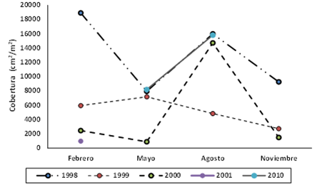 Para entender los posibles impactos de los eventos El Niño sobre las Lomas de Lachay se evaluaron las variables abióticas precipitación y humedad atmosférica y su relación con las ATSM del Callao, que muestran la diferencia de la Temperatura del momento con la Temperatura que normalmente existe en esa época del año en ese lugar (Woodman, 1998). Esta área del mar de la costa central es una de las zonas de afloramiento (Morón, 2000) y presenta aguas de origen ecuatorial que interactúan con las Aguas Costeras Frías (ACF) de este afloramiento costero (Flores et al., 2013). En las Figuras 4 (a, b, c, d, e) se muestran las ATSM para los años disponibles (2000, 2001, 2002, 2009 y 2010) relacionados con la precipitación total mensual, cada año presenta comportamientos diferentes de la precipitación en las lomas con respecto a las ATSM, destaca para el mes de enero del 2010 las ATSM más altas (3.05) y los valores más altos de precipitación (32.1 mm), pero a la vez este valor es muy alto para un mes de enero, esto se da porque se observa la continuación de un año 2009 con mayores condiciones húmedas y la entrada de ondas kelvin, posiblemente relacionado al Niño Global, además la humedad relativa para el mes de enero (95.55%) presenta valores altos, no sucede lo mismo con la captación de agua de niebla, donde los valores más altos se dan en los meses de octubre y noviembre, periodo donde se dan condiciones frías (Figura 4f). Esta información respalda los resultados similares para la cobertura vegetal promedio entre los meses evaluados en común para los años 1998 y 2010 (Figura 5), porque la ocurrencia de los eventos El Niño en estos dos periodos alteran la estacionalidad debido a que producen garúas de verano que favorecen el inusual desarrollo de vegetación (MINAG, 2002).