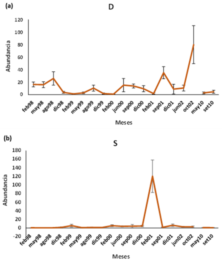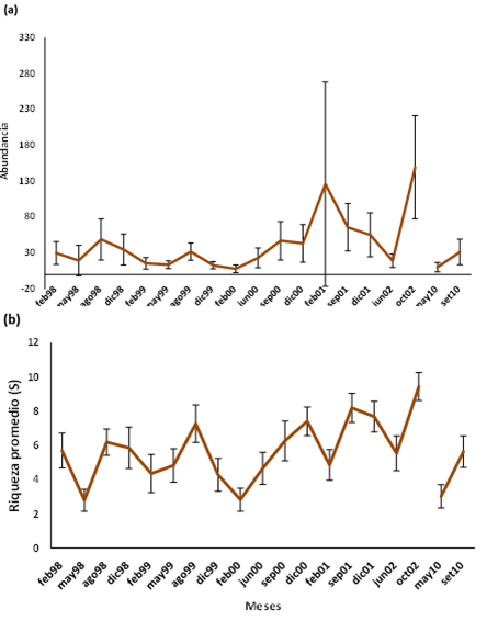 En relación a la evaluación del grupo taxonómico de coleópteros el grupo funcional depredador (D) está más relacionado a los eventos el Niño 1998 y 2002, y el Omnívoro (O) al Evento el Niño 2010. De los grupos funcionales se sugiere monitorear la abundancia del grupo depredador (Figura 7a) y para la época seca la abundancia del grupo saprófago (Figura 7b). Además, la abundancia (Figura 8a) y la riqueza de especies (Figura 8b) de los coleópteros, permiten observar el comportamiento del Evento el Niño 2002. En relación a la evaluación del grupo biológico de aves Zonotrichia capensis .Zenaida auriculata están relacionadas a los eventos el Niño 1998 y 2010 respectivamente, la diversidad alfa promedio y la diversidad gamma (Figura 9a) y la riqueza de especies de las aves (Figura 9b) permiten observar el comportamiento del Evento el Niño 1998.