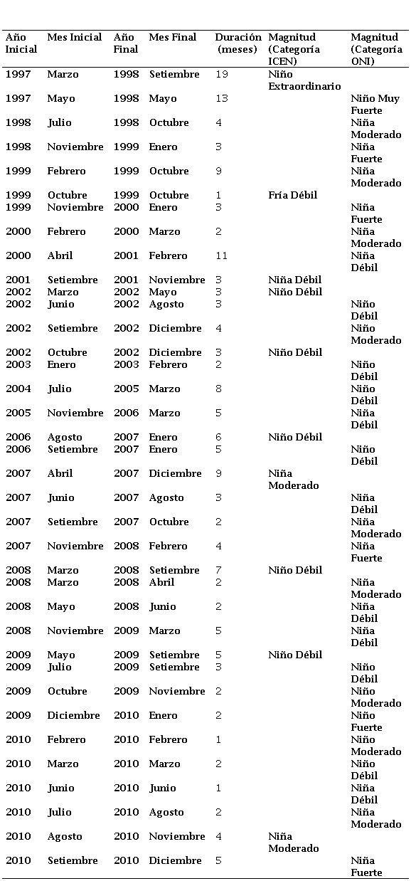 El Niño Oscilación del Sur (ENOS) es un ciclo irregular de calentamiento y enfriamiento que surge por la interacción entre el océano y la atmósfera. Se manifiesta, principalmente, en el Pacífico ecuatorial comprometiendo la región tropical y subtropical, un sistema de teleconexión de gran escala, con efectos globales, que ocurren a distintas intensidades y periodos del año cuya fase cálida puede ser llamada “El Niño” o “El Niño global”, dado que puede producir impactos remotos en todo el planeta pero cuyo calentamiento del mar no ocurre necesariamente en la costa de Perú sino en el Pacífico ecuatorial central; incluye al tipo de Niño “El Niño en el Pacifico central”, que en verano puede producir sequías en los Andes. Su fase fría es denominada “La Niña” (Morón, 2000; SENAMHI, 2016; Takahashi, 2017). Las teleconexiones suelen ser usadas como evidencia de estas relaciones entre fenómenos meteorológicos, en especial entre la región el Niño 3.4 y las precipitaciones en las regiones continentales (Giddings & Soto, 2006). En el presente estudio se define como evento El Niño a los eventos de años particulares (Tabla 1) tomando en cuenta dos índices: el ICEN (Índice costero El Niño) y el ONI (Índice de Niño Oceánico), donde algunas variables bióticas de esta investigación están más relacionadas al segundo índice.