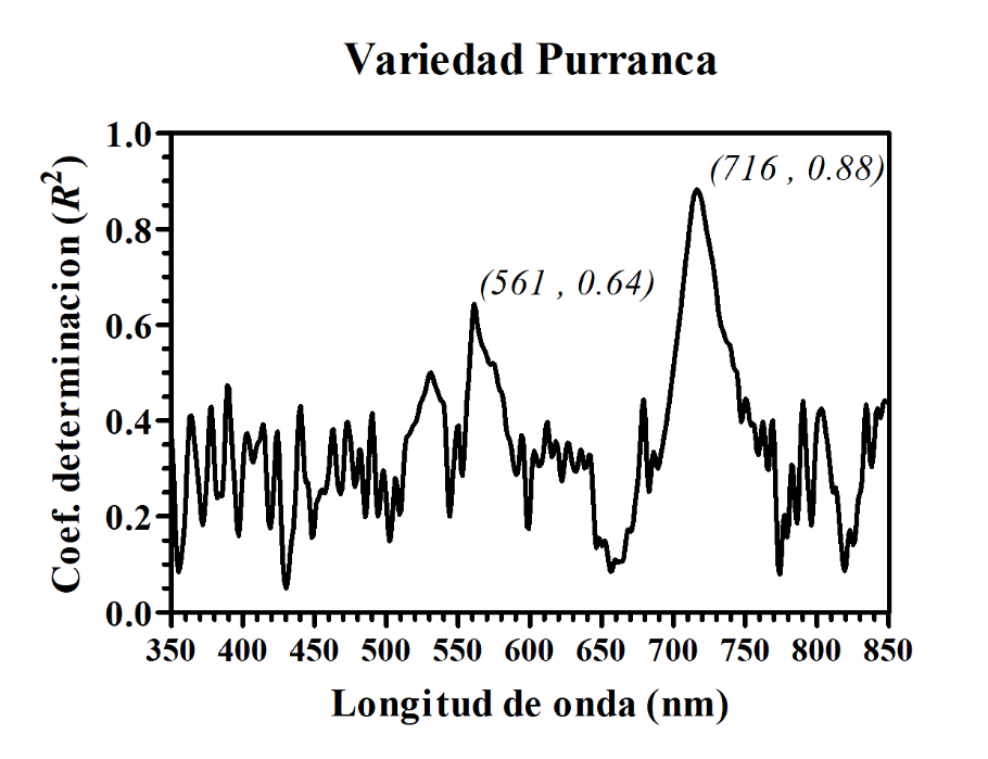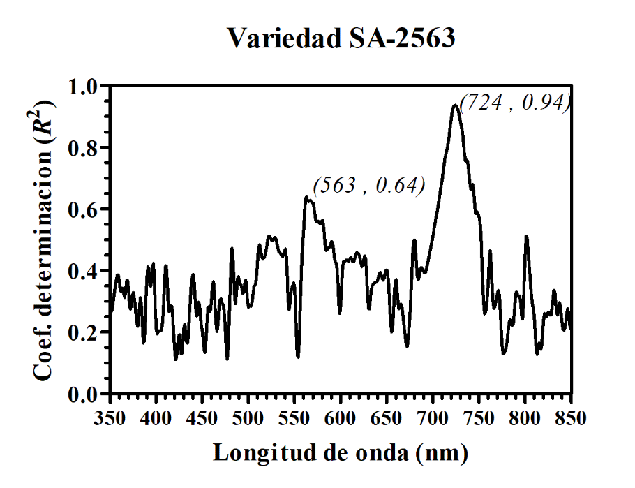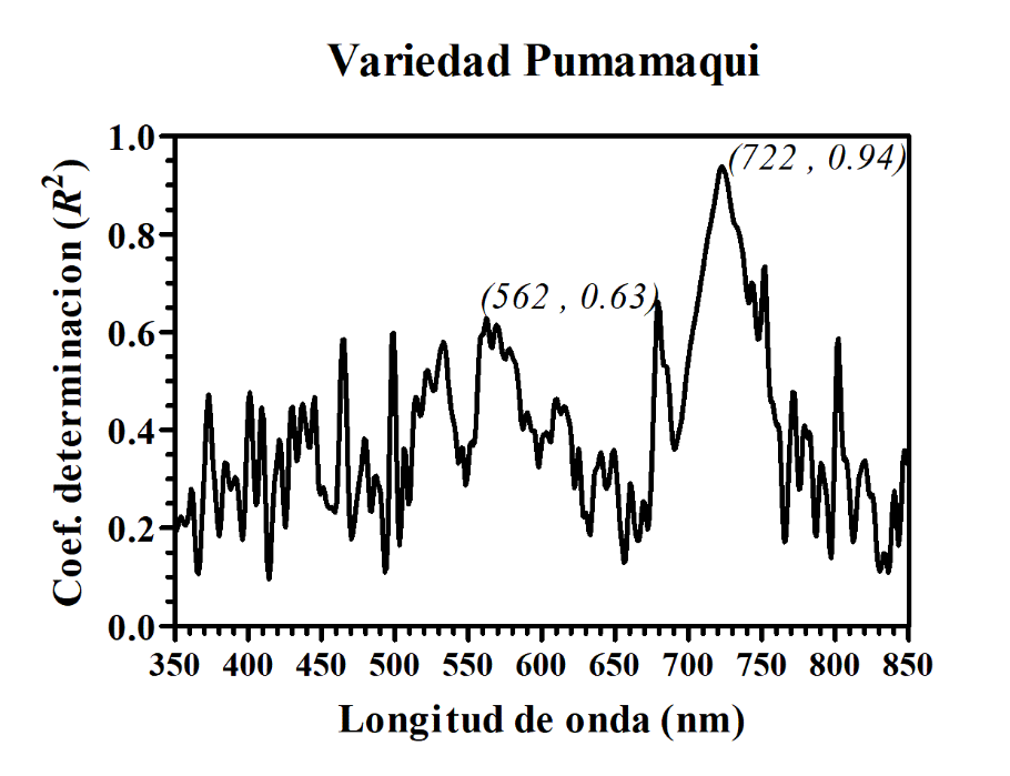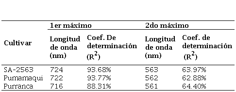 Las Figuras 8, 9 y 10 se obtuvieron al comparar las amplitudes por longitud de onda de la PDRλ con los valores relativos de clorofila SPAD obtenidos de los foliolos para cada uno de los 3 cultivares de papa, respectivamente. Se encontró que la primera derivada de la reflectancia de los foliolos de papa presentó una alta sensibilidad en la región espectral correspondiente al rojo y al verde. Estos resultados se resumen en la Tabla 2. Sin embargo, para cada uno de los cultivares de papa se encontró una ligera variación en la longitud de onda central correspondiente a los picos de mayor amplitud en los coeficientes de determinación. Así, los picos de mayor amplitud corresponden a longitudes de onda centradas en: 716 nm (Purranca), 722 nm (Pumamaqui) y 724 nm (SA–2563). En tanto, los segundos picos de mayor amplitud corresponden a longitudes de onda central aproximadamente en: 561 nm (Purranca), 562 nm (Pumamaqui) y 563 nm (SA–2563). Resultados similares, con dos picos máximos de coeficientes de determinación, fueron presentados en cultivos de arroz y algodón (Rao et al., 2008), en manzana, almendra y álamo (Ding et al., 2009).