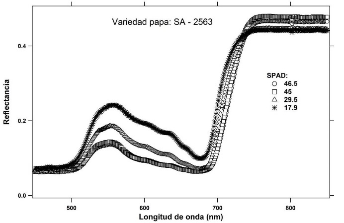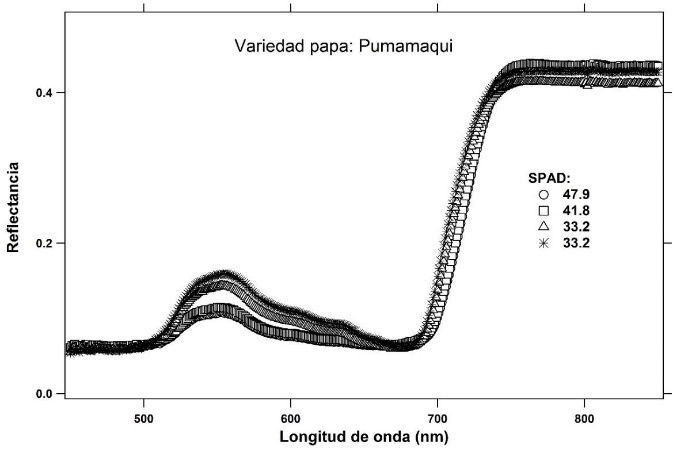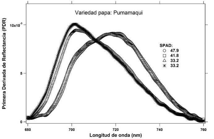Con el cultivar de papa Pumamaqui, las cuatro señales de reflectancia formaron dos grupos con una escaza diferencia entre ellos (Figura 4). Por otro lado, las lecturas SPAD presentaron un valor máximo de 47.9 y un mínimo de 33.2 unidades SPAD, un rango de 14.7, que representa casi la mitad de amplitud presentada por el cultivar SA–2563. Esta característica es importante tenerla en cuenta para la validación del método. La gráfica, correspondiente a la primera derivada de los espectros de reflectancia, muestra el mismo patrón de agrupamientos que los espectros de reflectancia, con dos picos que se aprecian en la Figura 5.